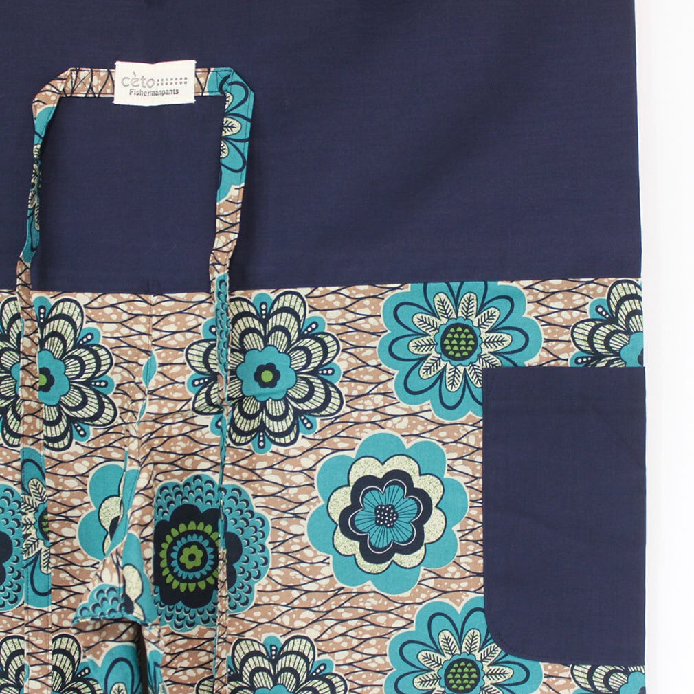 ターコイズブルーのポップなお花のスケアプリント。アフリカン柄ですが日本製コットン100%の生地です。折り返し・ポケットはネイビーのコットンツイル無地。