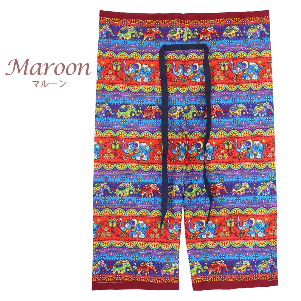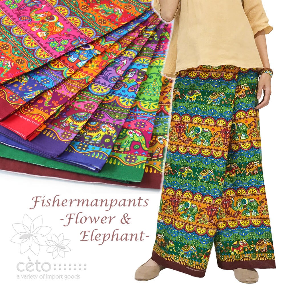 タイはチェンマイから、薄手コットンのプリント生地タイパンツ。元気になれる鮮やかでカラフルなお花とゾウさんのプリント柄7カラー。