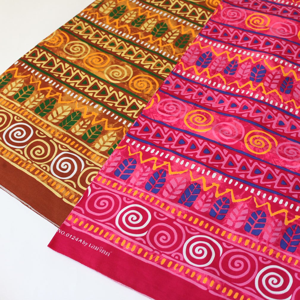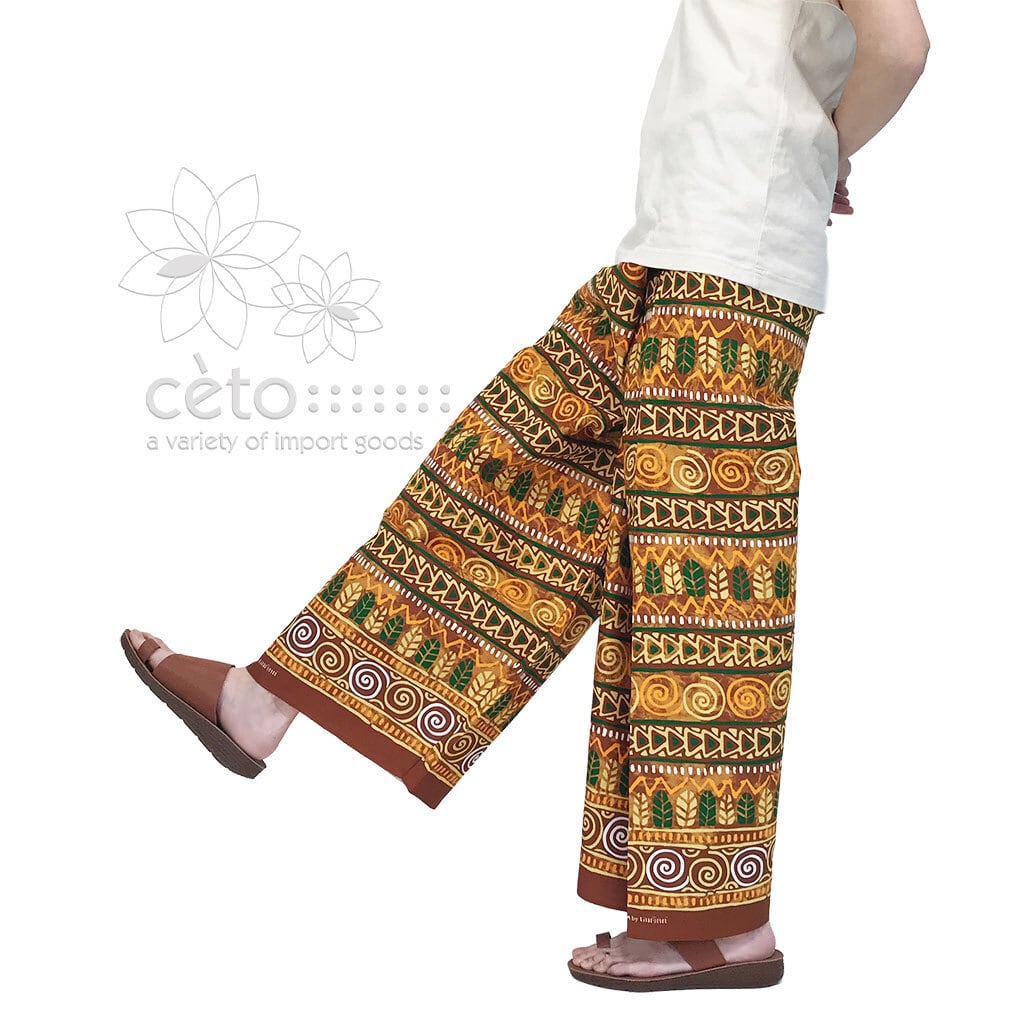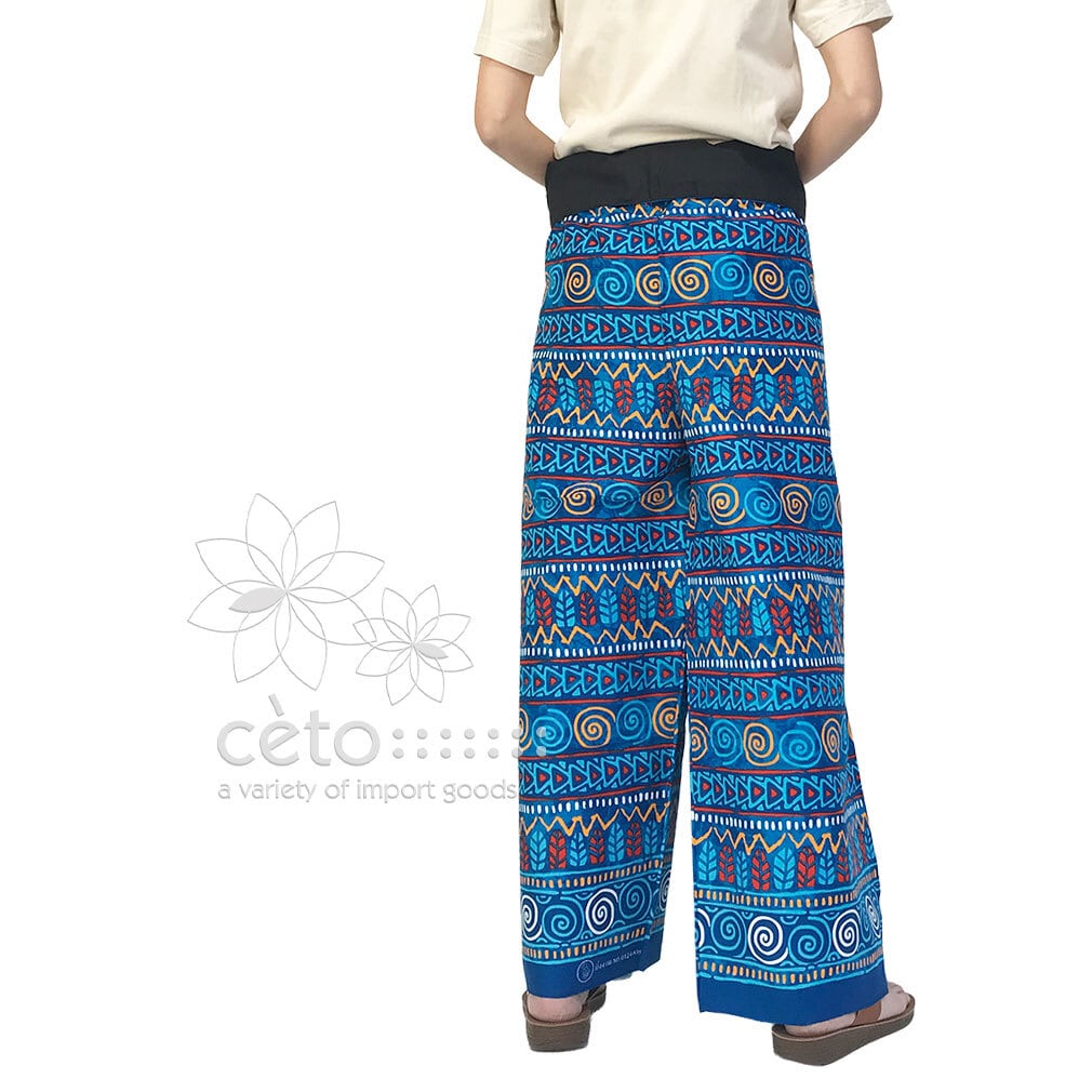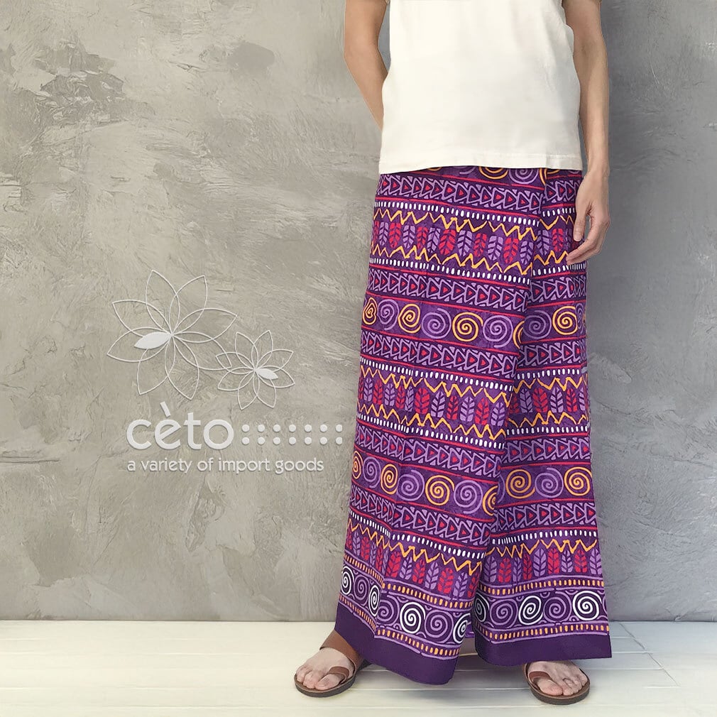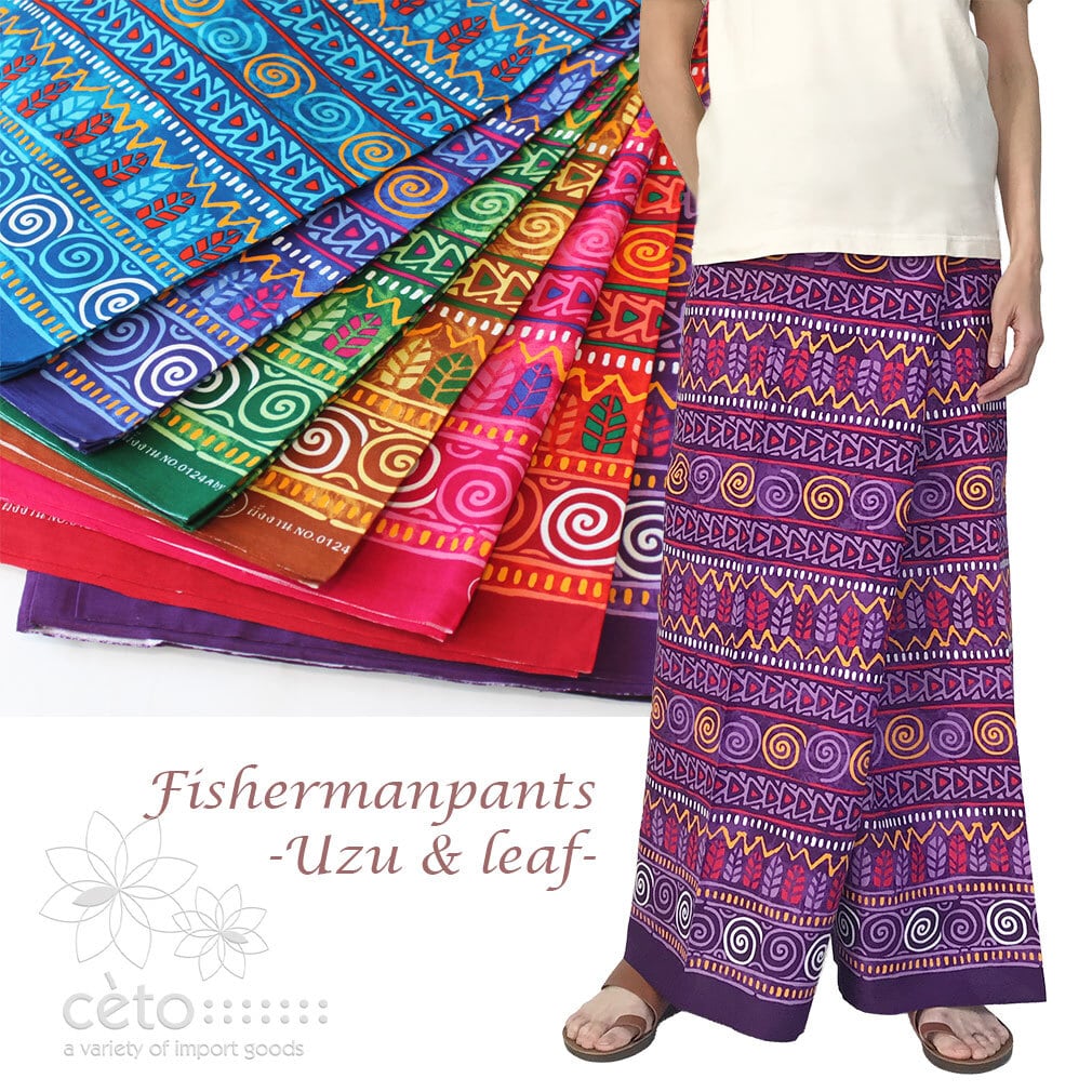 タイはチェンマイから、薄手コットンのプリント生地タイパンツ。渦巻きやリーフなどの鮮やかなプリント7カラー。