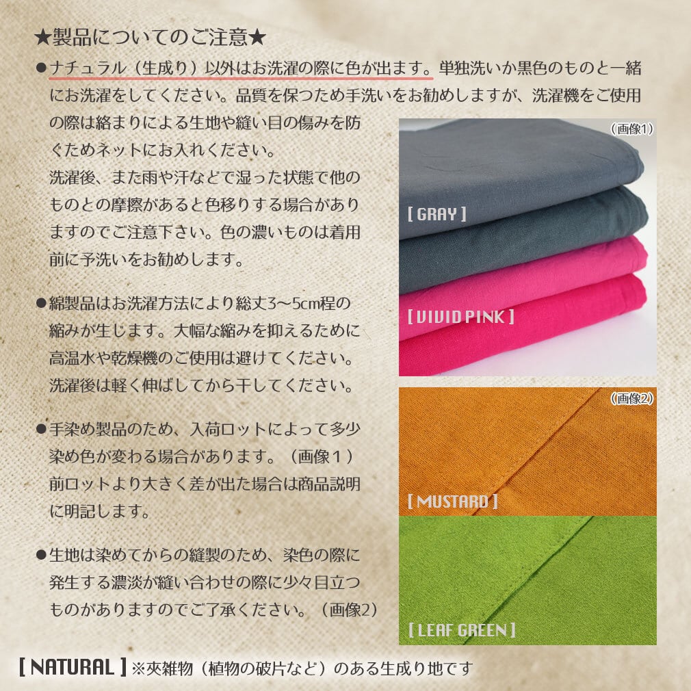 ・ナチュラル(生成り)以外はお洗濯の際に色が出ます。単独洗いか、黒色のものと一緒にお洗濯をしてください。品質を保つため手洗いをお勧めしますが、洗濯機ご使用の際は紐の絡まりによる生地の縫い目や傷みを防ぐため洗濯ネットにお入れください。洗濯後、また雨や汗などで湿った状態で他のものとの摩擦があると色移りする場合がありますのでご注意下さい。色の濃いものは着用前に予洗いをお勧めします。