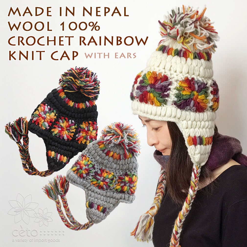 ニット帽 帽子 クロシェットレインボー ボンボン ネパール ウール100% 耳あて 耳つき フリース裏地付き レディース 【メール便送料無料】